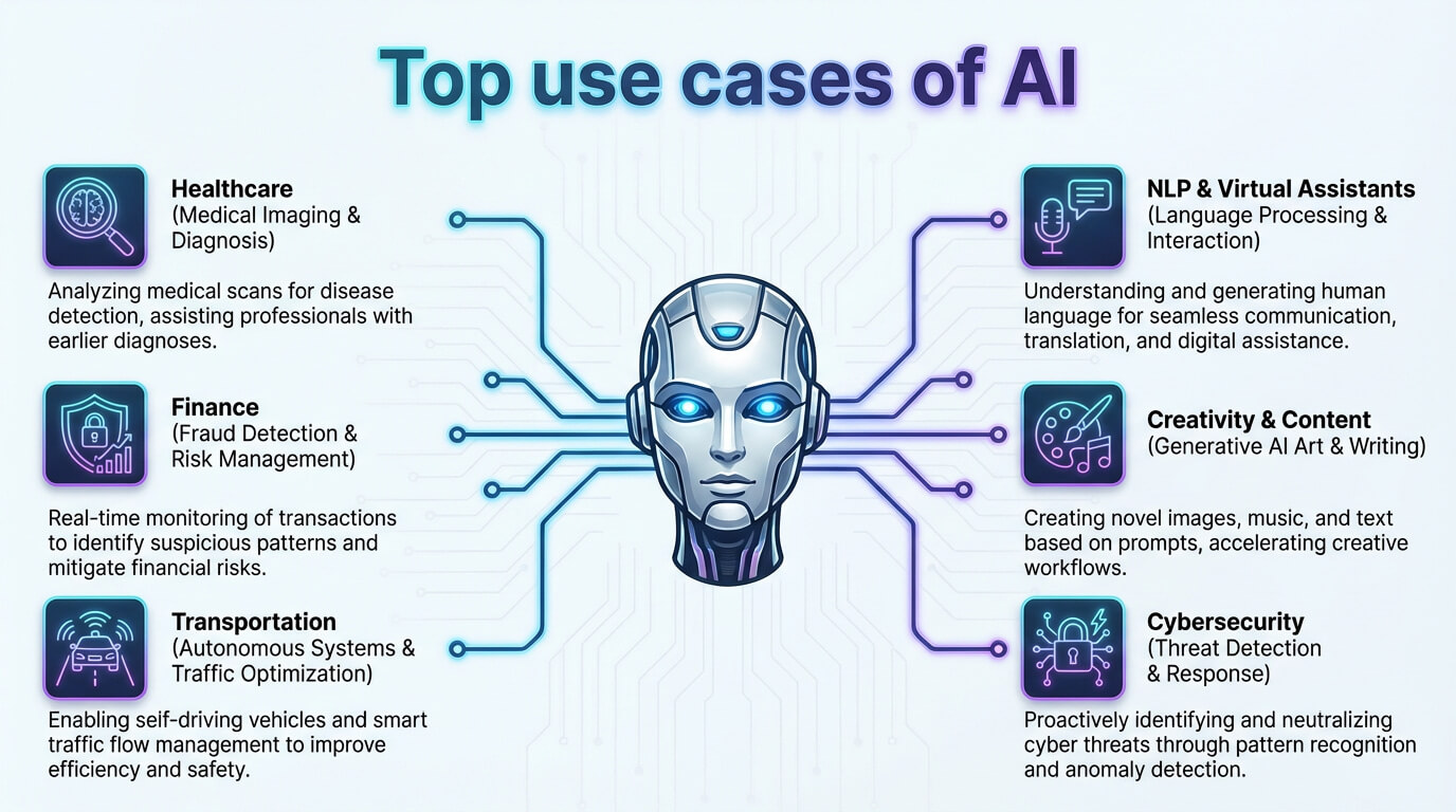 The uses of artificial intelligence include fraud prevention, agriculture, business, education, media, robotics and surveillance, as well as healthcare, transportation, customer service, finance, supply chain management, creative industries, and scientific research.