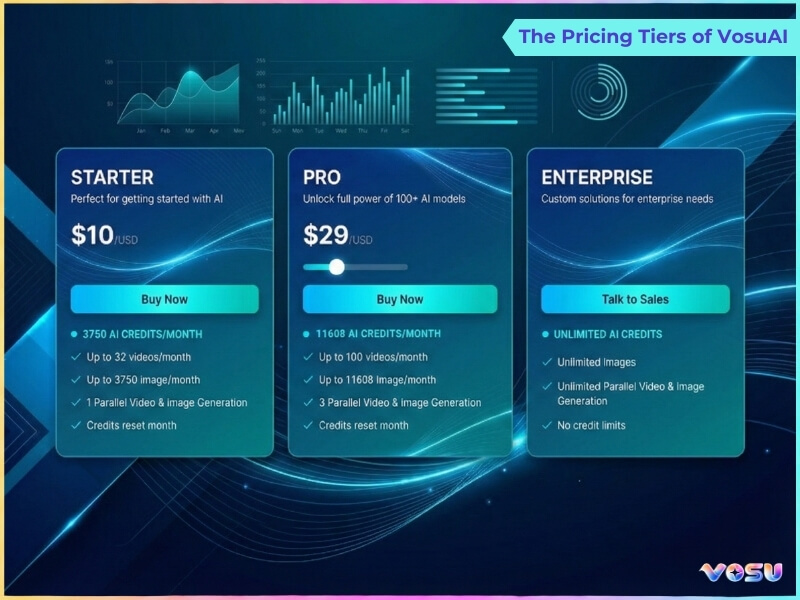 VosuAI provides three subscription tiers like starter, pro and enterprise. VosuAI pricing starts at $10 per month for the starter plan with 3,750 credits, the pro plan costs $29 per month with 11,608 credits and the enterprise plan offers flexible, customizable pricing. It also provides customized subscription options, which allow users to buy custom credit packages based on their scale and workflow needs. VosuAI provides access to over 100 video generation models like the Kling AI, Veo 3 and Sora series.