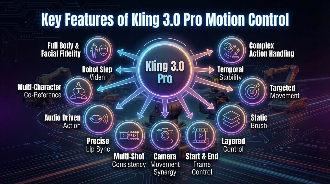 The key features of Kling 3.0 Pro Motion Control are visualised below.