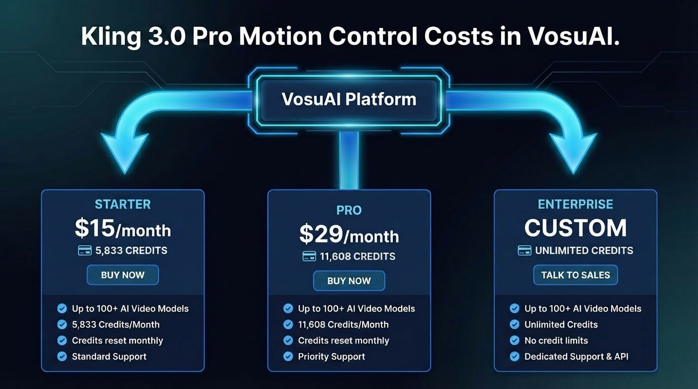 Kling 3.0 Pro Motion Control is also available through VosuAI, which offers credit based monthly subscription plans like starter, pro and enterprise. VosuAI pricing tiers start at 15 USD per month with 5833 credits, 29 USD per month with 11,608 credits for pro plan and the enterprise plan with customizable cost and credits. These credits allow users to use over 100 AI video models like Kling series, Sora series, Veo 3.1, alongside Kling 3.0 Pro Motion Control within one workflow.