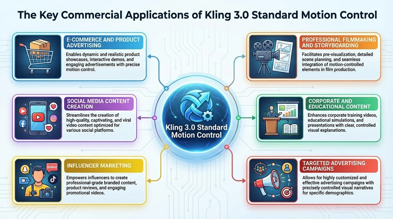 The applications of Kling 3.0 Standard Motion Control include social media videos, cinematic direction, narrative consistency, physics based action, audiovisual synchronization, virtual influencers, pre-visualization, brand presentations, product demos and multilingual localization.