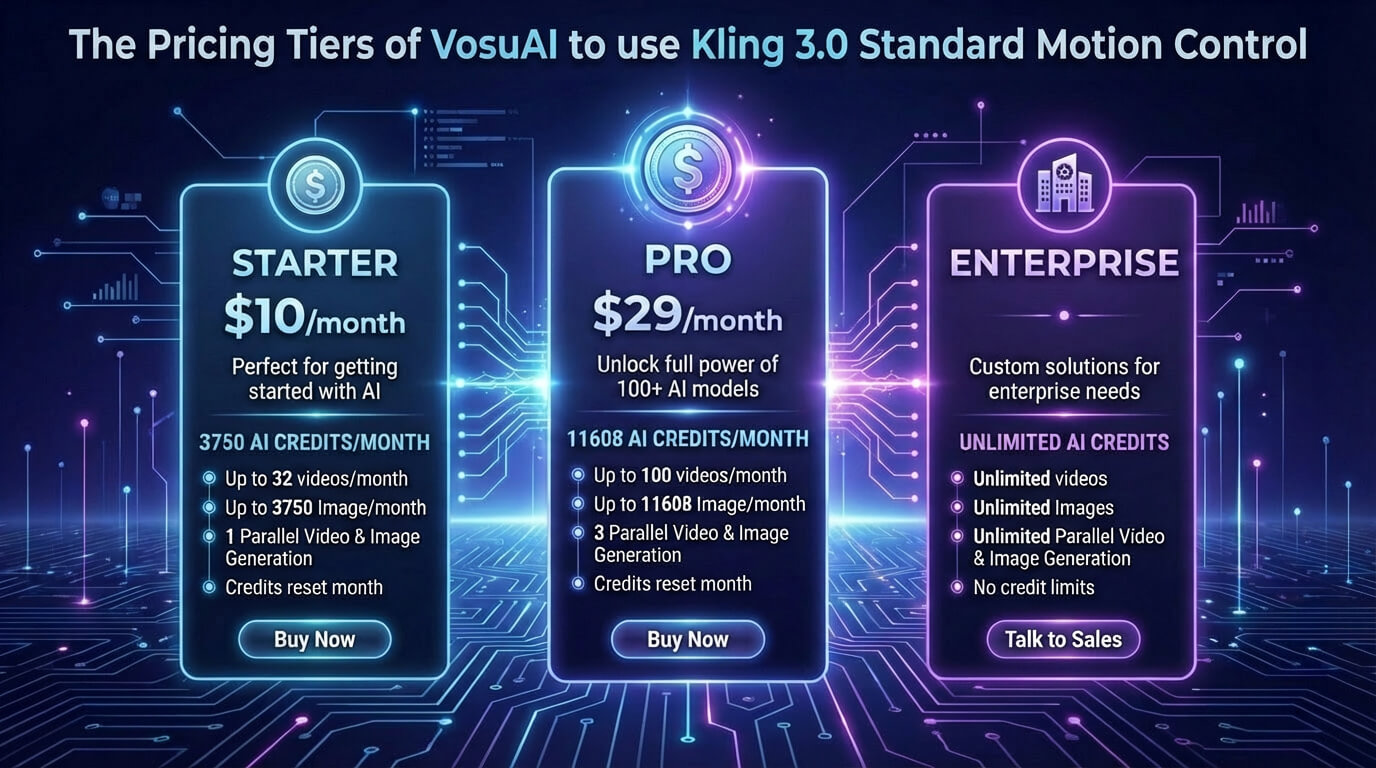 VosuAI has three credit based, customizable monthly subscription plans like starter, pro and enterprise. VosuAI pricing starts at $10 per month for the starter plan with 3,750 credits and $29 per month for the pro plan with 11,608 credits, while enterprise pricing is customized to business needs. It also offers over 100 video generation models like Kling v2.6, v2.6 pro, Kling 3.0 standard and pro under a single subscription plan.