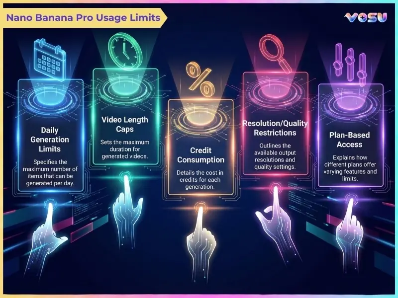 Yes, you can use Nano Banana Pro for free because Google offers a small daily free quota in the Gemini app, but strict Nano Banana Pro limits apply and change over time. VosuAI provides limited access before requiring subscriptions or credits. You can get higher limits and more features through paid plans, which unlock larger daily caps and 4K output.