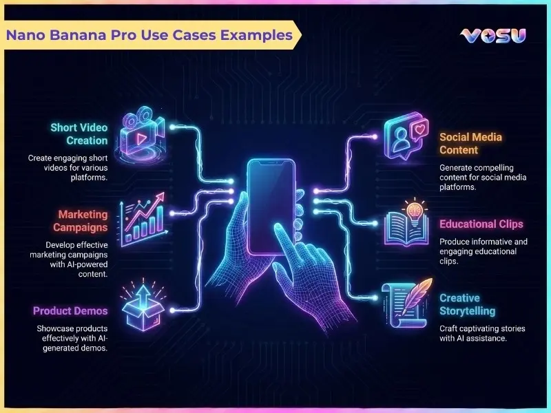 Creators use Nano Banana Pro to generate highly detailed, context aware images for social content, thumbnails, videos and brand assets. They rely on it to streamline content creation for YouTube, courses and newsletters by turning ideas into polished visuals. Creators use Nano Banana Pro inside Google’s Gemini interface and Google Workspace surfaces for in-document artwork and through VosuAI to build educational infographics, marketing visuals and stylized character sheets.