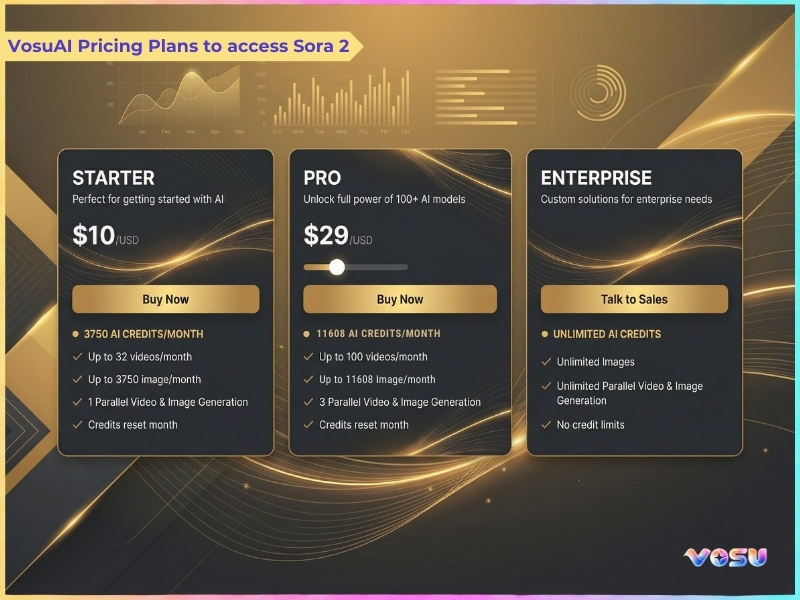 Sora 2 is accessed by users through VosuAI with its credit based subscription instead of using OpenAI directly. VosuAI offers monthly plans with limited credits and access to over 100 video generation models, which include Sora 2 and Sora 2 Pro. VosuAI costs start at $10 per month for the basic plan with 3,750 credits, $29 per month for the Pro plan with 11,608 credits and an enterprise plan with unlimited usage. These credits are usable across Sora 2, Sora 2 Pro and other supported video generation models.