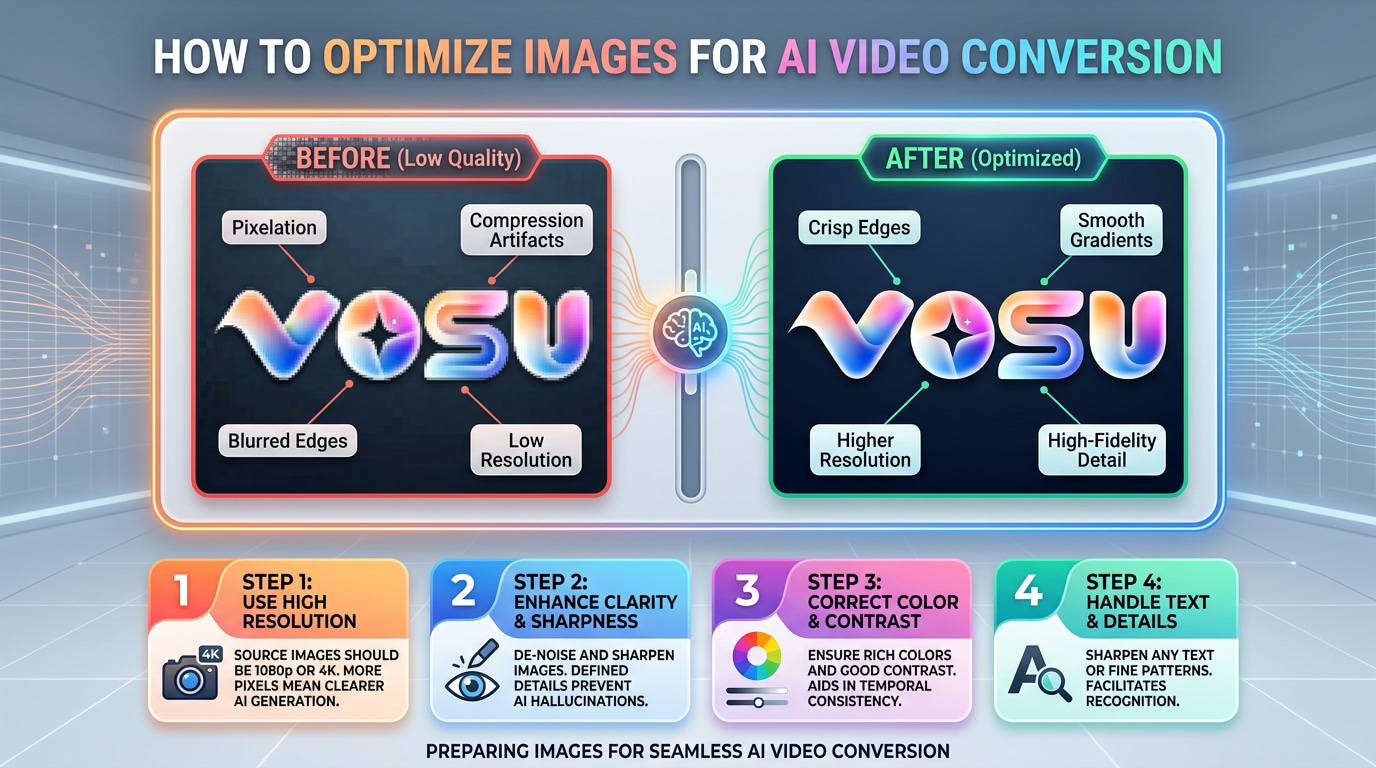 To select high quality images for AI video creation, choose photos with high resolution (at least 1080p). Use optimized file formats such as JPEG, PNG, or WebP and make sure the colors and lighting remain consistent to create smooth transitions between frames. Check each image for sharpness, clarity and no blurriness. Ensure all images share a similar aspect ratio and maintain visual consistency and a cohesive look throughout the video. High quality images matter because they improve the video’s clarity, professionalism and ability to stand out. Low quality or mismatched images cause pixelation, distracting transitions and reduce viewer engagement.