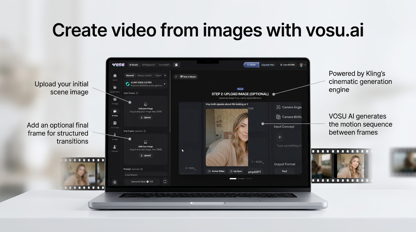 - Image to video generation: Vosu AI transforms static images or photos into dynamic video sequences, which opens up new possibilities for marketing campaigns, digital storytelling and social media engagement.